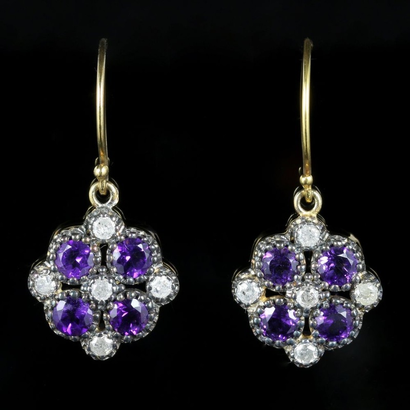These fabulous cluster earrings are made in the Victorian style and boast beautiful Amethysts and Diamonds in a flower design.