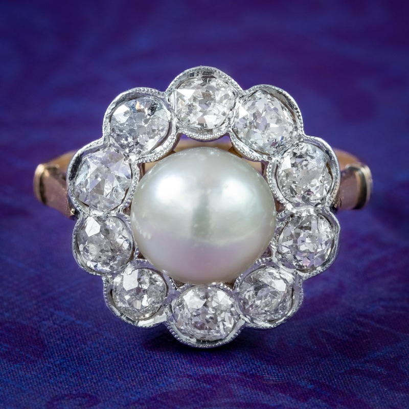 A stunning antique Edwardian daisy cluster ring adorned with a lustrous natural pearl in the centre, haloed by ten bright old mine cut diamonds, totalling approx. 1.5ct. The stones are set in a milgrain, platinum gallery with an 18ct gold band at the back with a fabulous open-work under gallery with a star setting hidden behind the pearl.