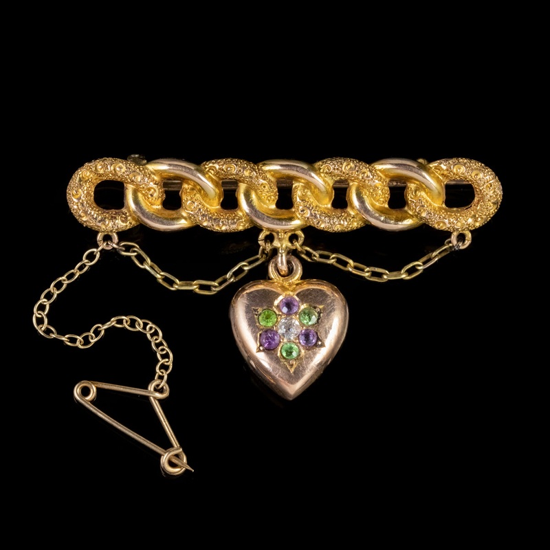 A fabulous Antique Edwardian Suffragette brooch featuring a solid 15ct Yellow Gold chain link gallery with two hanging chains and a lovely Rosy 9ct Gold heart decorated with 0.05ct Peridots, Amethysts and a central 0.08ct Diamond.