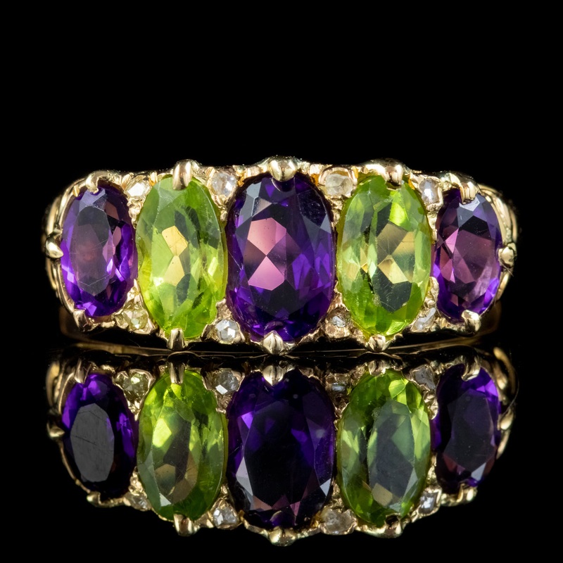 A colourful Antique Suffragette ring from the early 20th Century claw set with large green Peridots and violet Amethysts with small twinkling Diamonds nestled in between.