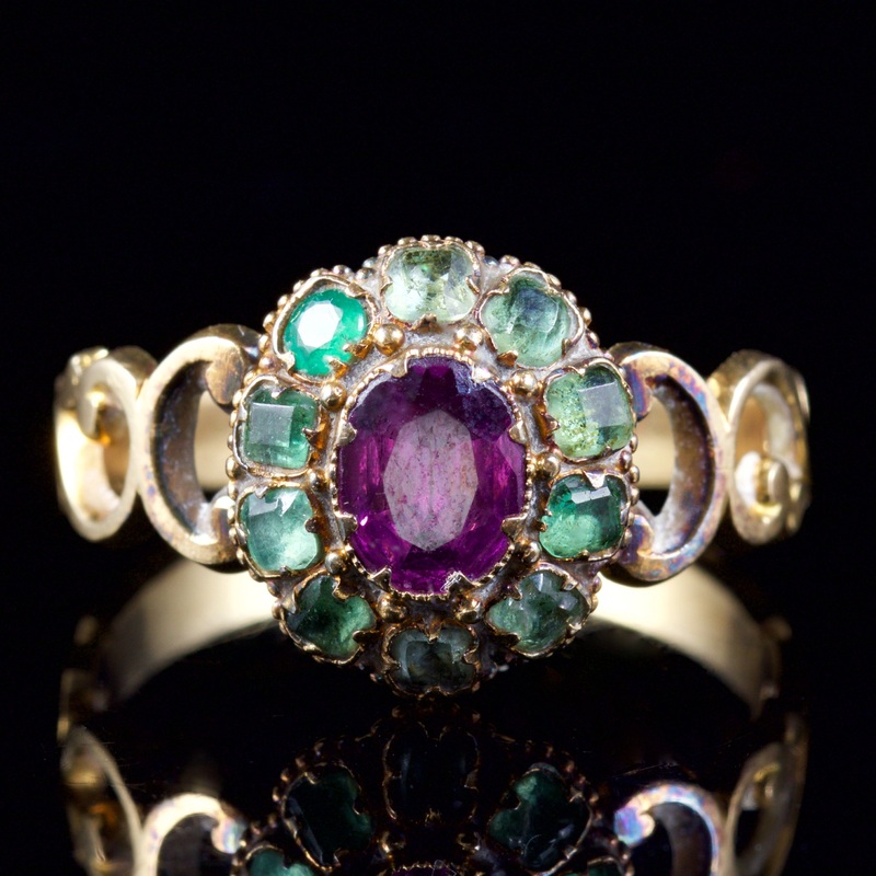 The ring is decorated in the most beautiful Almandine Garnet surrounded by wonderful, green Emeralds.