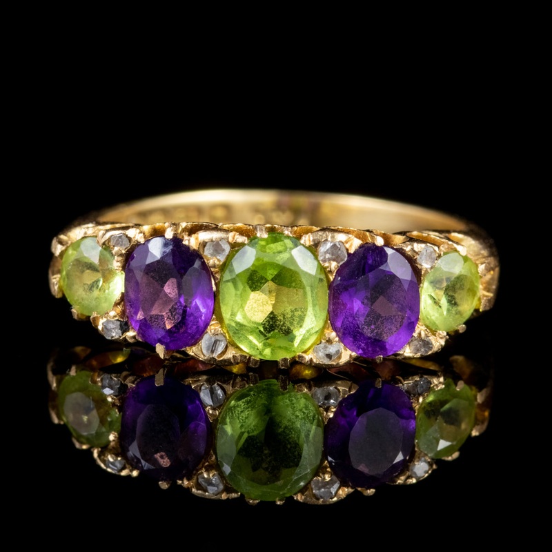 This beautiful Edwardian ring was crafted in 1905 during the Suffragette movement and features three bright Peridots, 0.50ct in the centre and 0.15ct at either side. Two 0.30ct Amethysts bracket the central stone, with petit Diamonds set in between.