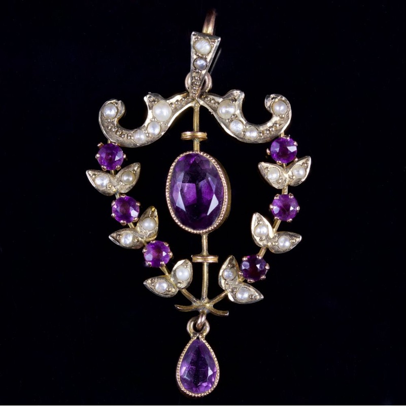 The wonderful pendant is decorated in deep purple Amethysts and creamy Pearls.