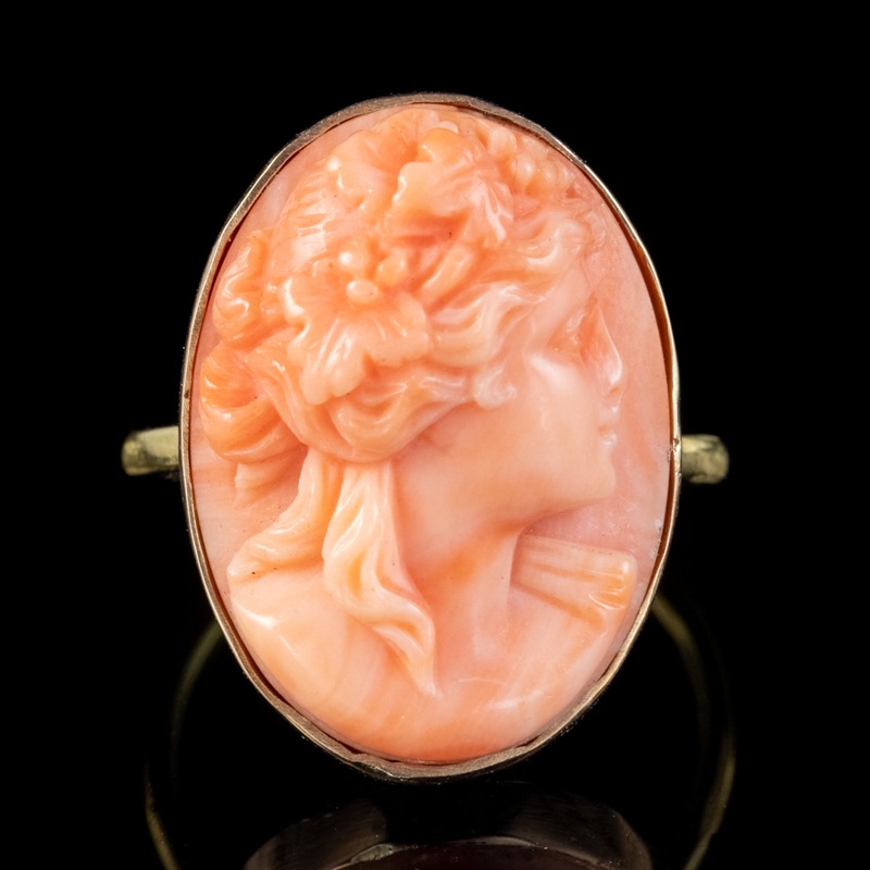 An exquisite Antique mid Victorian ring (Circa 1870) set with a stunning high-relief Cameo hand carved from Coral. It depicts a detailed side profile of a beautiful lady with leaves and grapes in her hair.
