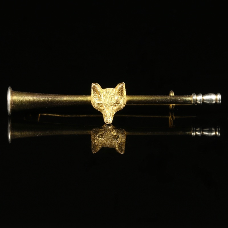 This fabulous antique Victorian brooch is set with a foxes head sat on a horn, all set in 9ct Yellow Gold, Circa 1880.