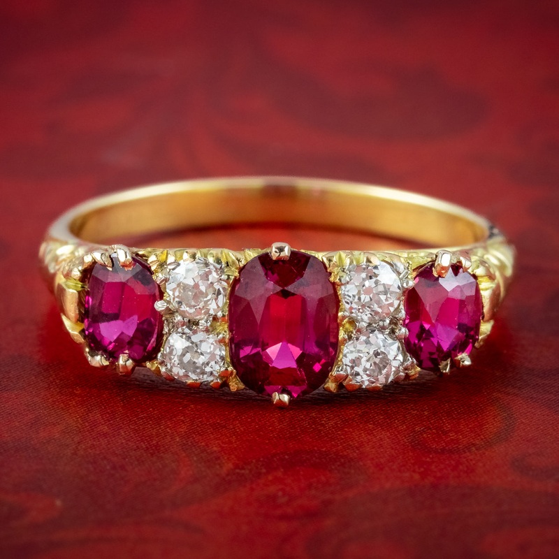 A gorgeous antique Victorian carved half hoop ring adorned with a trilogy of natural rubies weighing 0.60ct in the centre, 0.25ct on either side (approx. 1.1ct total). They have an alluring, deep cherry-pink hue and are complemented by four bright old mine cut diamonds nestled in between with excellent VS1 clarity H colour (approx. 0.40ct total).