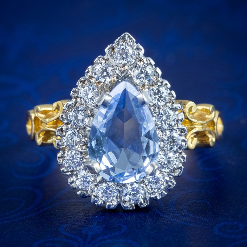 A striking Victorian-inspired cluster ring, crowned with a beautiful pear cut synthetic aquamarine with a clear-blue hue. Its claw set in the centre of a teardrop gallery, framed by bright brilliant cut cubic zirconia around the outside.
