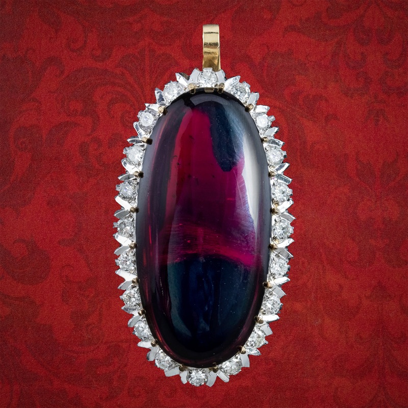 A fabulous vintage pendant from the 1970s built around a mammoth cabochon garnet weighing an impressive 15 carats (approx.) The cabochon is polished and smooth with a dark surface that glows cherry-pink when it catches the light. Its haloed by twenty sparkling brilliant cut diamonds around the border that have excellent VS1 clarity H colour (approx. 1ct total).